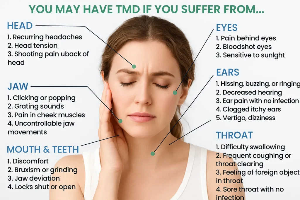 Every patient experiences TMD differently. Below is a comprehensive list of potential symptoms associated with TMJ dysfunction: